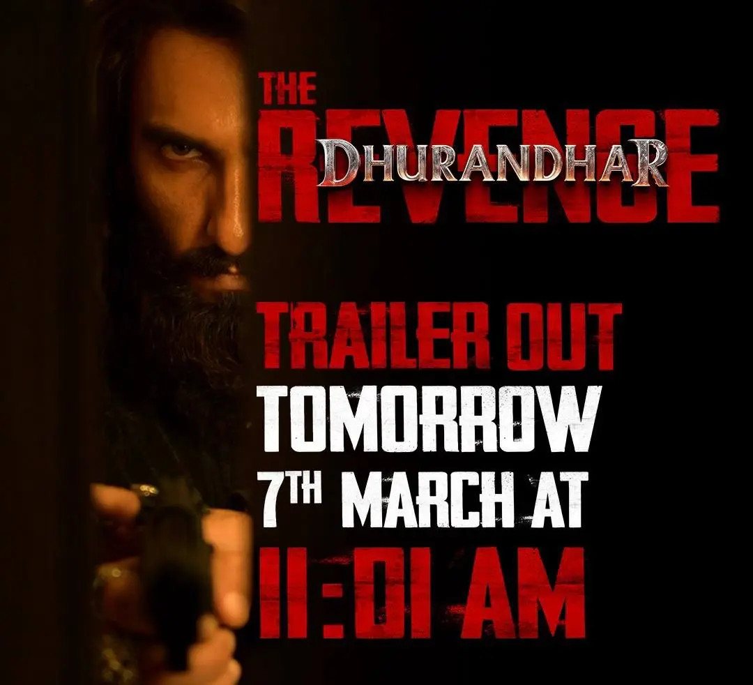 Ranveer teilte das Poster auf Instagram und schrieb: „Machen Sie sich bereit, der Trailer erscheint morgen, 7. März, um 11:01 Uhr #DhurandharTheRevenge erscheint am 19. März 2026 weltweit in den Kinos in Hindi, Telugu, Tamil, Kannada und Malayalam“, und kündigte an, dass der Trailer am 7. März um 11:01 Uhr erscheinen wird.