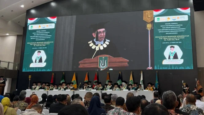VIVA Kulturminister Fadli-Zone den Titel verliehen Honorarprofessor politische und kulturelle Bereiche/Wissenschaften aus Nationale Universität (Nägel), Mittwoch, 11. Februar 2026. Der verliehene Titel basiert auf den intellektuellen Werken und kulturellen Diensten, die Fadli Zon geleistet hat.