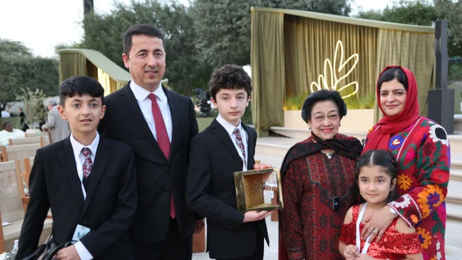 Währenddessen umarmte Megawati Zarqa Yaftali fest, die zu ihr kam. Sie unterhielten sich herzlich. Zarqa stellte sogar ihre Kinder und ihren Mann vor, die sehr stolz auf die Auszeichnung waren. Das Kind umarmte die Tafel fest. Dann lud Zarqa seine Familie ein, ein Foto mit Megawati zu machen.