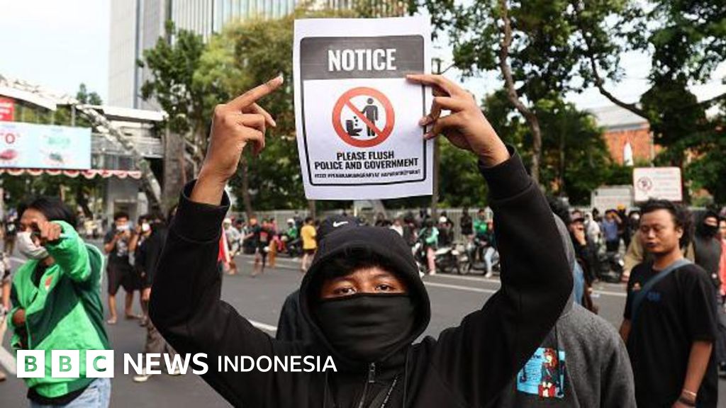 Keterangan gambar, Para pengunjuk rasa menampilkan poster selama protes terhadap Kepresidenan Prabowo pada 29 Agustus 2025 di Surabaya, Indonesia.